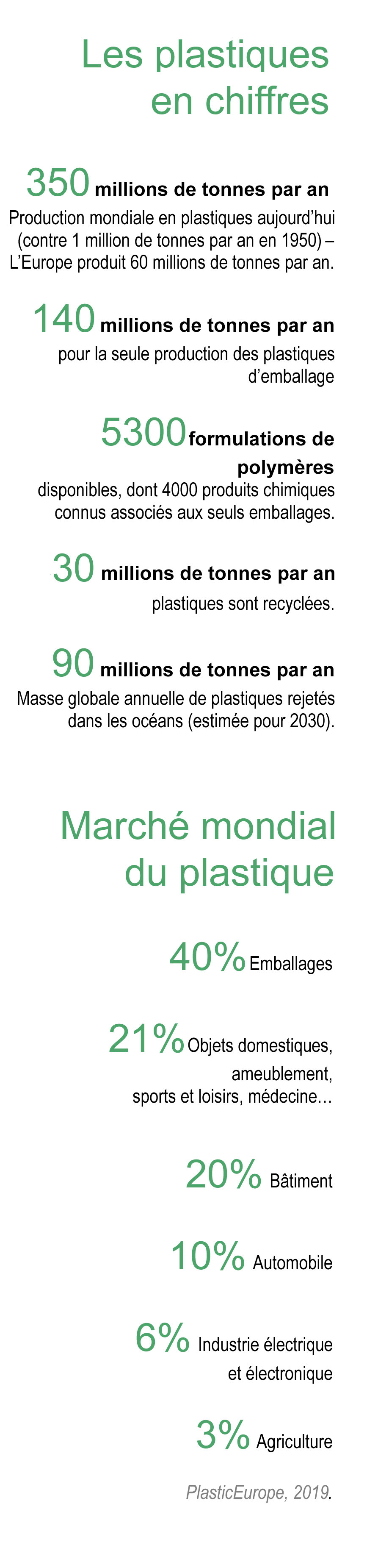 Avec leurs multiples propriétés (légèreté, résistance mécanique et chimique, rigidité, souplesse ou élasticité), les plastiques sont devenus en l’espace de quelques décennies des matériaux incontournables, tant dans le secteur industriel que pour les usages de la vie domestique. En témoigne leur production mondiale qui ne cesse de croître, passant de 1 million de tonnes par an en 1950 à plus de 350 millions de tonnes par an aujourd’hui.